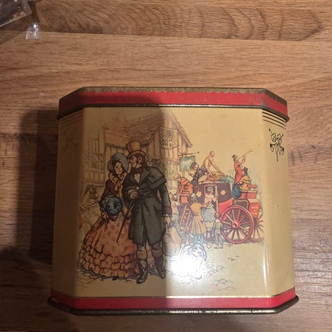 McVITIE & PRICE, engelsk kexburk i plåt från 1930/40-talet. Mått 23,5 x 22 och höjd 25 cm. Hel i plåt men skadat papper, se bilder.