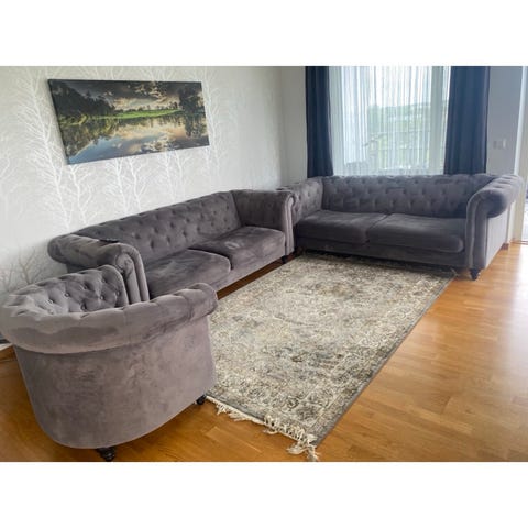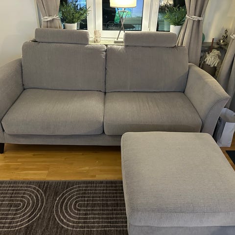Gott skick för att vara en +10 år soffa. Inga djur, barn eller rökare. Finns en liten skada i underkant, se bild. Lite nopprig på vissa ställen, se bilder. En kudde har en lagning men den är längst in så syns inte samt att kuddarna är vändbara (se bild).