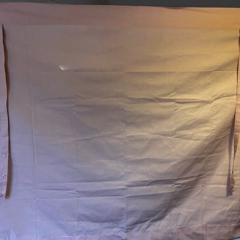 Gardin kappa i bomull med fransar Kappan är ljusblå med diskreta rosa och vita ränder nära kanterna. Passar för att dekorera bord och ytor i hemmet.