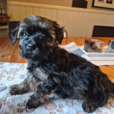 Valparna är en blandning mellan bichon havanais och dvärg pudel och har färgen harlekin utan stamtavla.( allergivänlig)