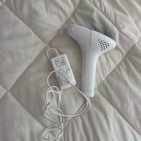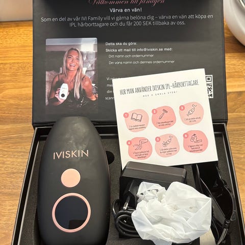 Iviskin Ivi Family hudvårdsapparat i vit färg. En enhet för hudvård med tillhörande laddare och förvaringsbox. Designad för hemmabruk. Laser glasögon.