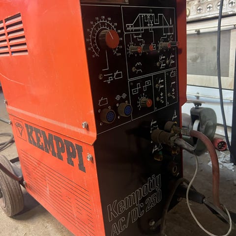 Kemppi Migomac MIG-svets med inställningar för strömstyrka och gasflöde. Utrustad med kabelanslutningar och kontrollpanel för justering av svetsparametrar. Används för metallsvetsning med MIG-teknik.
