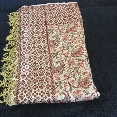 Handvirkad vit spetsduk med ett mönster av cirklar och blommor. Passar som bordsdekoration eller överkast för mindre möbler.
