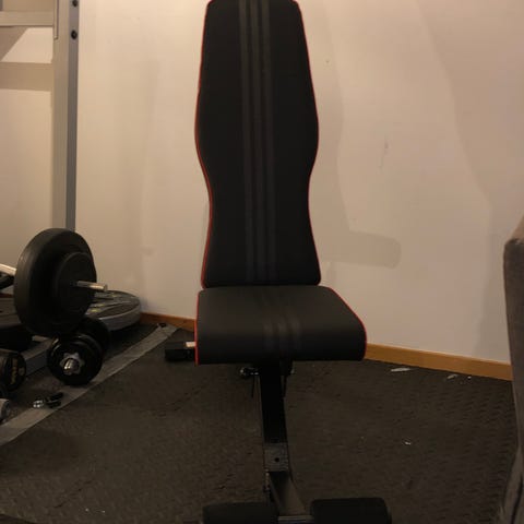 Justerbar träningsbänk i svart färg med sitt- och ryggstöd. Bänken är designad för olika träningsövningar och kan justeras för att anpassas efter användarens behov.