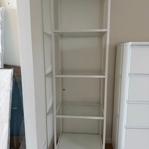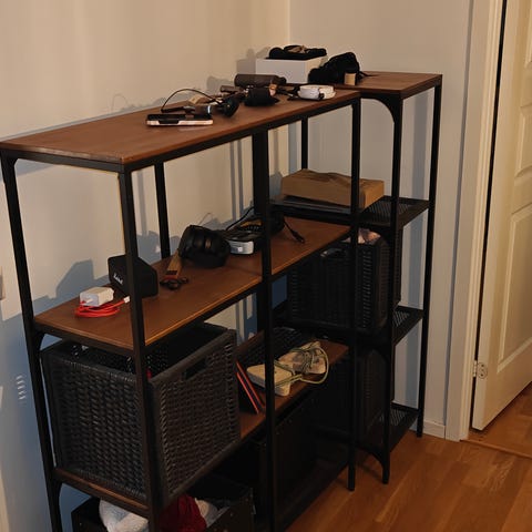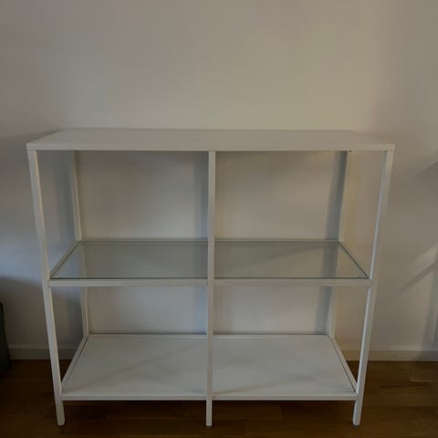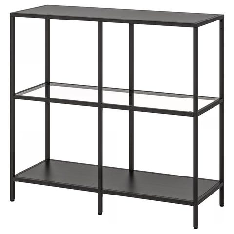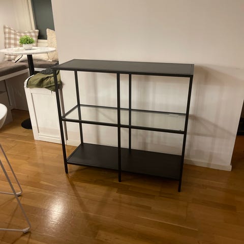 VITTSJÖ Hylla från ikea, svartbrun med glas skivor.