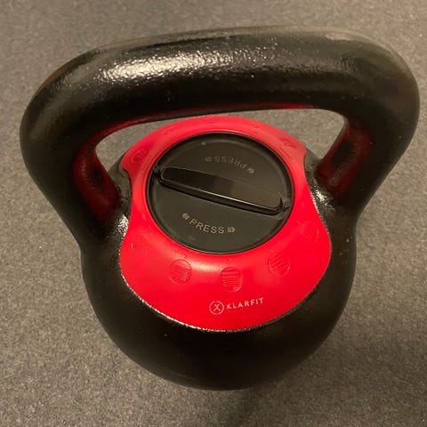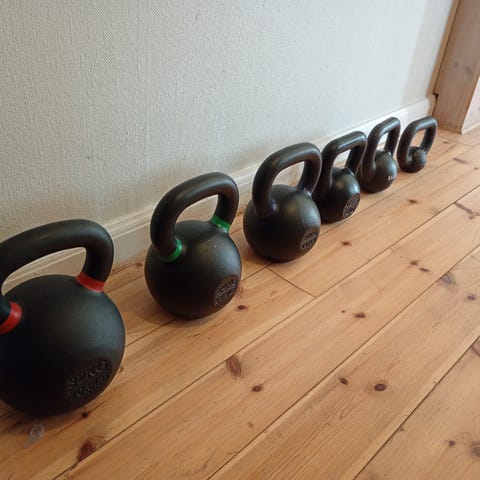 Kettlebell set med flera vikter och färger. Kettlebells är tillverkade i metall med handtag och används för styrketräning och funktionell träning.