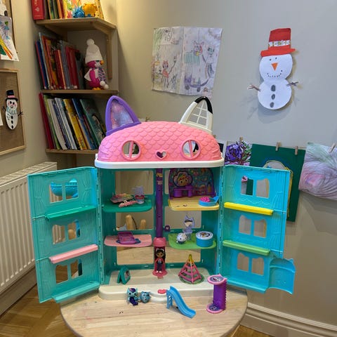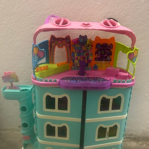 Gabbys dockhus med flera rum och olika tillbehör. Inkluderar små figurer och möbler för lek. Passar för barn och är tillverkad i plast.