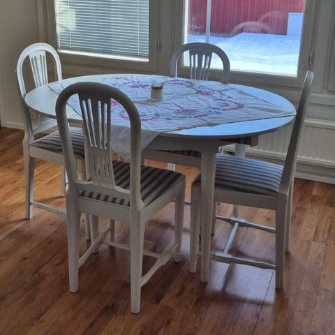 Härlig matgrupp. Bord med 2 iläggsskivor samt 6 matchande stolar