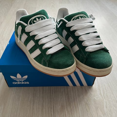 Säljer ett par gröna adidas sneakers i modell Campus 00s då storleken inte passar, de är unisex och passar vem som helst. Skorna är avsedd för vardagligt bruk och har bara använts ett fåtal gånger. De köptes nya för 1200kr för mindre än ett år sedan. Två extra skosnören och skolåda ingår.