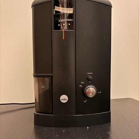 Wilfa kaffemaskin med flera utbytbara delar och tillbehör. Inkluderar maskin, olika komponenter för bryggning samt mätverktyg. Maskinen är avsedd för hushållsbruk.