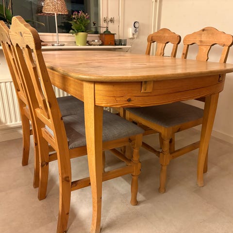 Vackert antikt bord! Säljer det pga platsbrist. 105cm i diameter och 73cm högt. Finns 2 iläggsskivor där varje skiva är 30cm breda. Det går att skruva loss benen för enklare frakt. Finns i Bålsta!