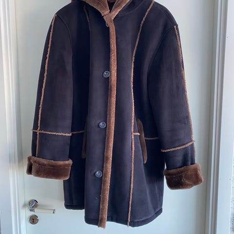 Fin mörkbrun mockakappa med pälskrage, fodrade ärmar och teddyliknande material på insidan. Mockaskärp med snyggt spänne. Obs liten storlek, som 40 skulle jag säga. Smickrande passform. Gott skick, inga synliga skador eller slitage.