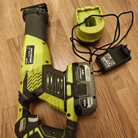 Ryobi One+ RRS1801M såg med två batterier. Sågen är batteridriven och levereras med två batterier för användning. Passar för olika sågjobb där batteridriven såg krävs.