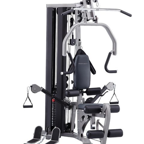Multigym för hemmaträning med flera funktioner för styrketräning. Utrustad med sittplats, dragstång, viktmagasin och olika träningsstationer för att träna olika muskelgrupper.