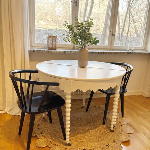 Runt bord med en diameter på 100 cm och fyra stolar. Vissa tecken på användning finns därav det låga priset. Några "pluppar" för att dölja skruvarna på stolarna saknas. De fläckar som syns på sista bilden har jag inte testat något annat än diskmedel för att få bort, kan fungera med exempelvis "mirkelsvamp" eller liknande.