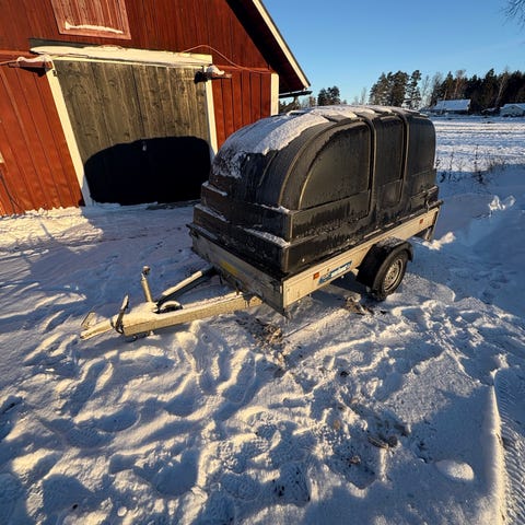 Rekotrailer . Släpvagns lås . Bromsat släp. Totalvikt 1000kg. Lastvikt 730kg.