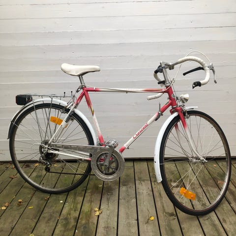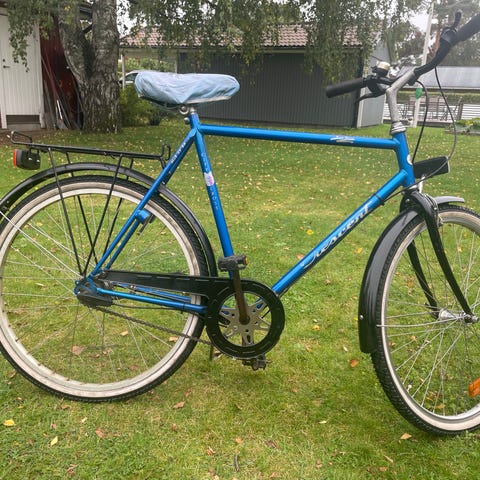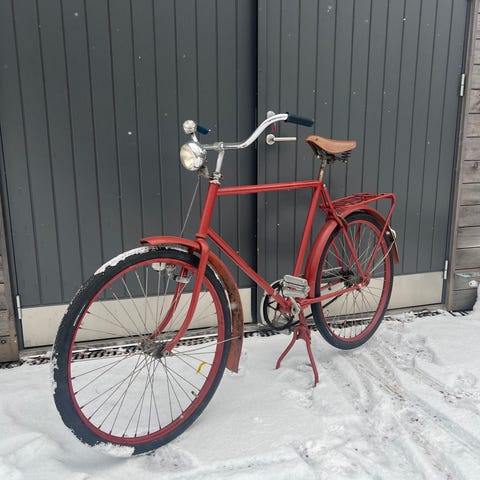 Fint patinerad ram med välhållna detaljer i rostfritt och krom. Oväxlad med vanlig fotbroms. Klassiskt bärhandtag på ramen. Grundligt nyservad med utbytta nya däck, Prima tekniskt skick.