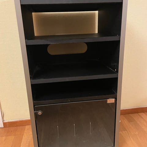 Skivspelarskåp i trä med en öppen hylla för skivspelare och ett nedfällbart dörrutrymme med förvaringsfack. Skåpet har dekorativa detaljer längs nederkanten.Bredd 80 cm, djup 45 cm, höjd 65 cm. Några mindre fanerskador. Avhämtning i Täby