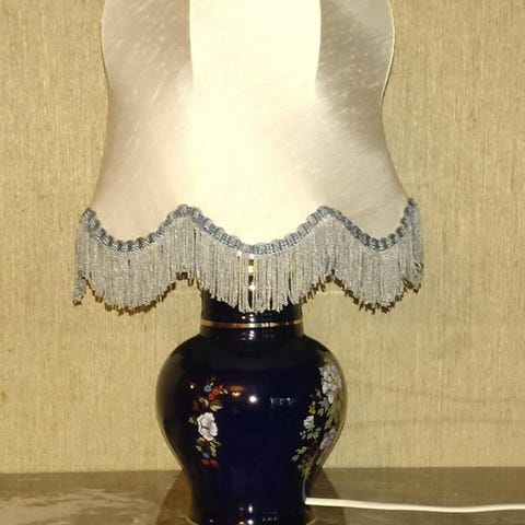 Bordslampa med en dekorativ design i metall. Lampans höjd är cirka 43 cm och fotens diameter är ungefär 11 cm.