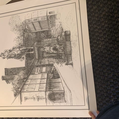 Oidentifierad oljemålning som föreställer ett landskap med hus och en person. Målningen är inramad och visar en scen med hus med röda tak och en väg som leder mot bakgrunden. Färgerna är dämpade med inslag av grönt, blått, brunt och rött. Motiv från Borstahusen Landskrona. Hjalmar Lindblom.