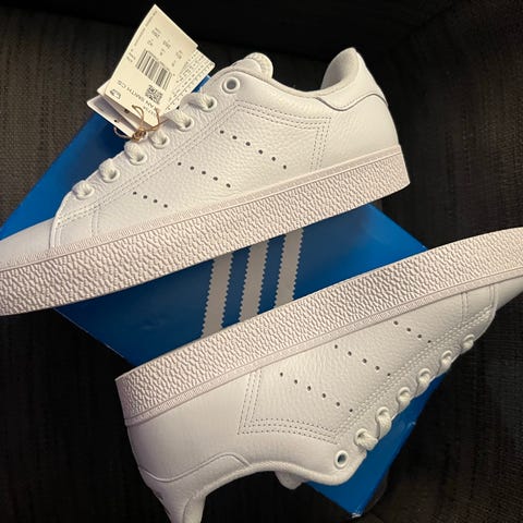 Adidas sneakers i storlek 42,5 med blå och vit färg. Skorna har en klassisk design med snörning och är tillverkade i material som ger komfort och hållbarhet. Passar för vardagligt bruk.