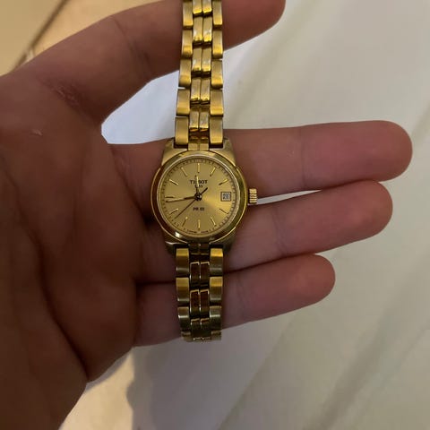 Vintage Tissot damklocka med manuell uppvridning. Klockan har en guldfärgad boett och ett matchande armband. Urtavlan är ljus med svarta markeringar och visare. Klockan kommer med en svart Tissot-påse. Baksidan av boetten är märkt med "Chs Tissot & Fils", "Plaque Or G 20 Microns" och "Fond Acier Inoxydable".