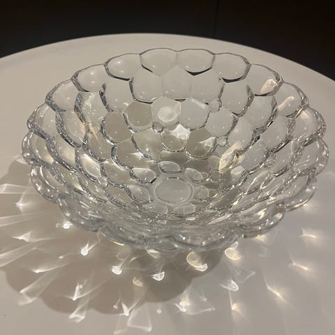 Orrefors hallonskål. Skålen är tillverkad i en rund form med upphöjda bubblor som dekoration.