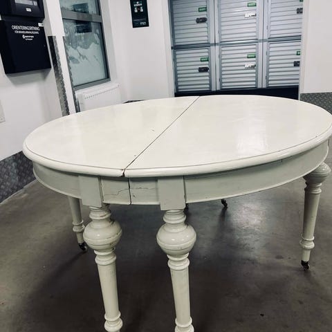 Vintage månbord som går att dela på och använda vardera del för sig eller ihop som ett runt matbord. Bordet har ljuvliga svarvade ben och en härlig patina, som det blir på 100+ år. Gillar man inte den slitna looken som jag, så går det fint att slipp, olja, betsa eller måla om bordet. Mått: diameter 115- 117cm, höjd 75cm. Finns i Telefonplan.