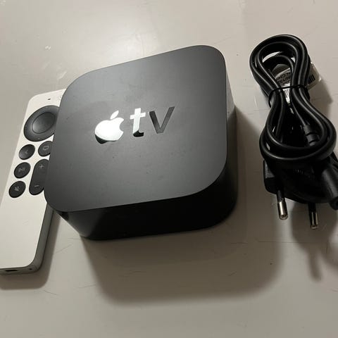 Apple TV digital mediaspelare Gen 3. Tillhörande fjärrkontroll och nödvändiga kablar för anslutning.