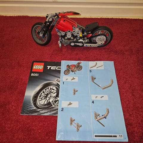 Sökord: LEGO Technic, Shock Cycle, 8838, motocross, vintage, retro, Technic byggset, 1991, chain-driven engine, V2 motor, suspension