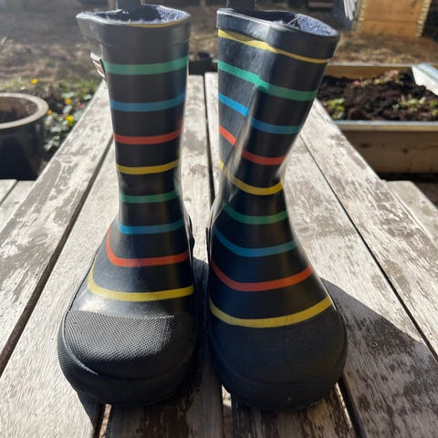 Hunter barnstövlar i regnbågsfärger, unisexmodell. Väl använda men i fullt fungerande skick.