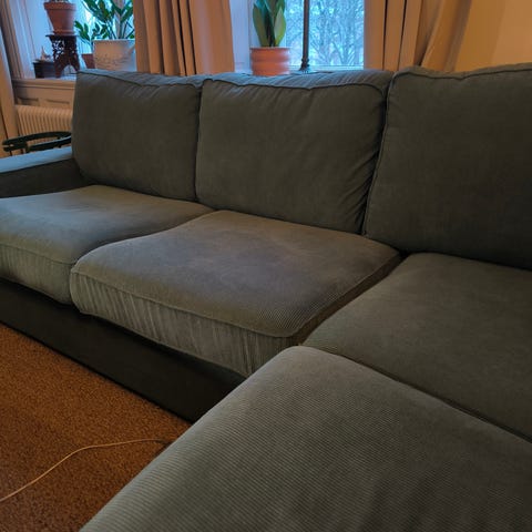Modell stor Divansoffa i grått med flyttbara nackkuddar. 3,30 lång divan höger 2m andra divanen 140cm