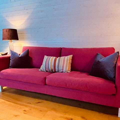 Designsoffa i bra skick. Lite solblekt men fin. Sköna dunplymåer med skumkärna. Orange-röd. Kan monteras isär (3 delar)
