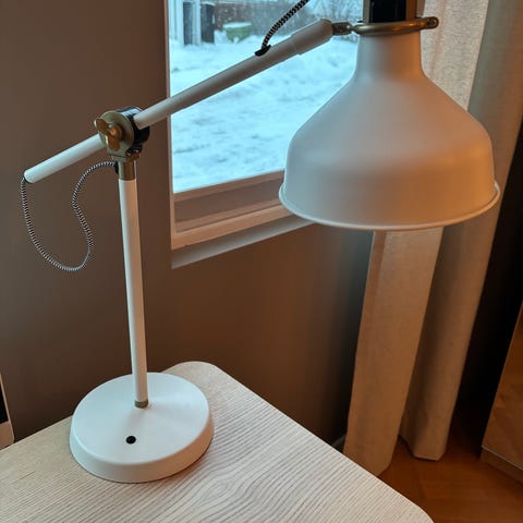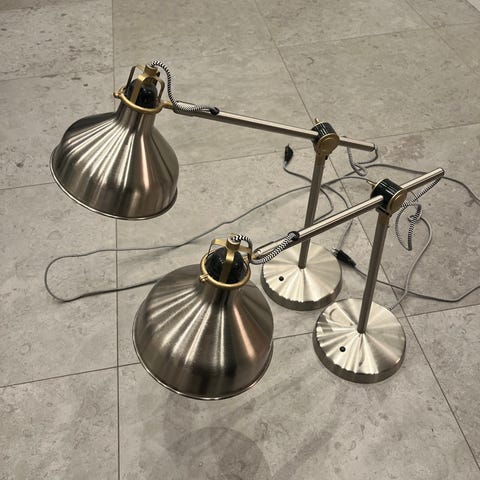 2 RANARP lampor i vitt med mässingsdetaljer och snyggt klädd elsladd. Använda men det syns överhuvudtaget inte. Kostar 399 kr/styck på IKEA.