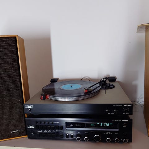 Med radio, cd-spelare, skivspelare? bandspelare. Ett antal cd-skivor och Lp-skivor medföljer.