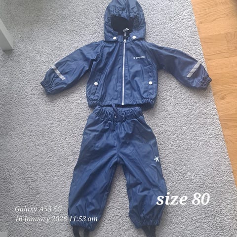 Blå regn overall från rainwear by Lindex storlek 80. Avtagbar huva. Hel och ren, Något slitna gummiband vid fötterna annars mycket fint skick. Nypris för liknande:399:-
