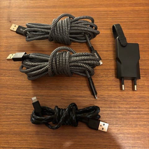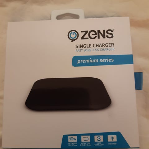 Laddare för elektroniska enheter. Aldrig använd - insåg att den inte var kompatibel med våra telefoner när jag öppnade instruktionerna. Maximal effekt 10 W. Ultratunn 5 mm design. 3 års garanti fortfarande tillgänglig - papern in i lådan. Qi-certifierad. För iPhone och Samsung. Laddar genom telefonfodral upp till 3 mm tjocka. Halkfri yta.