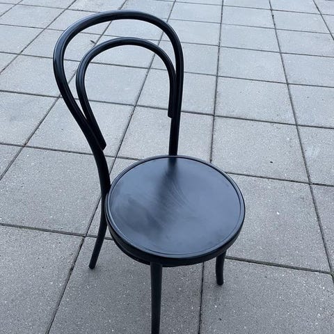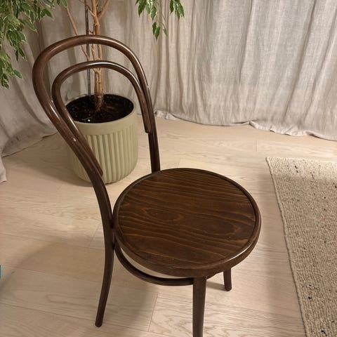 TON no 14 klädd med Elmo läder på en björkskiva med stoppning. Tidigare i rotting. Sitsarna är helt nyklädda och i topp skick. Finns 4st