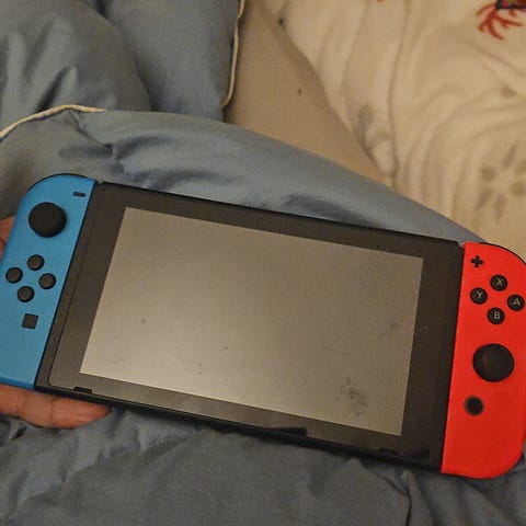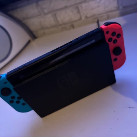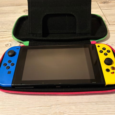 Nintendo Switch spelkonsol med två Joy-Con-kontroller i blå och röd färg. Konsolen har en pekskärm och kan användas både som bärbar enhet och ansluten till TV via , vilket möjliggör spel både hemma och på resande fot.