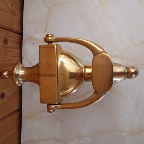Krok att hänga på väggen. Kroken som är tillverkad i mässing, gör att enkelt plockas av sin hållare. Motivet är lite ovanligt med Adam, Eva och äppelträdet på själva bakstycket och kroken utgörs av ormen.