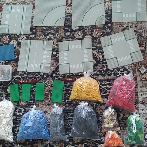 LEGO byggklossar och tillbehör i olika former, färger och storlekar. Innehåller ett varierat urval av bitar inklusive fordon, basplattor och andra delar. 17 kg.