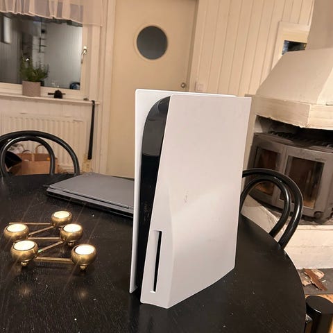 Playstation 5 spelkonsol i vit färg. Konsolen har en modern design med svarta detaljer och kommer med en trådlös handkontroll. Utrustad med flera anslutningsportar på baksidan för tillbehör och nätverksanslutning.