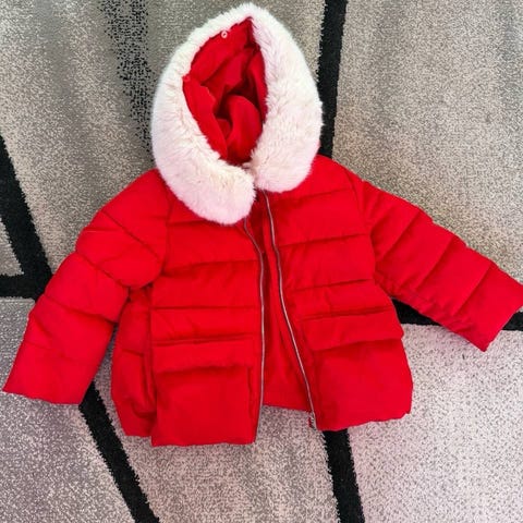 KappAhl barnjacka i grön färg, storlek 98 för flicka. Jackan är tillverkad av polyester och har en avtagbar huva med rosa pälsimitation. Insidan är fodrad med rosa material. Jackan är designad för att ge värme och skydd vid kallt väder.