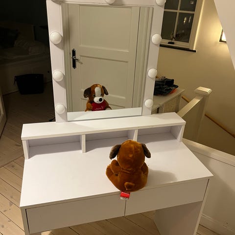 IKEA sminkbord med oval spegel och två små lådor på bordsskivan samt en större låda under. Bordet är vitt och har en slät yta med böjda ben. Passar för användning som sminkbord eller skrivbord i hemmiljö.