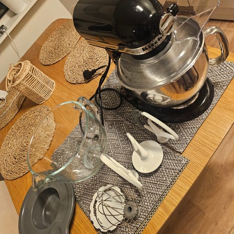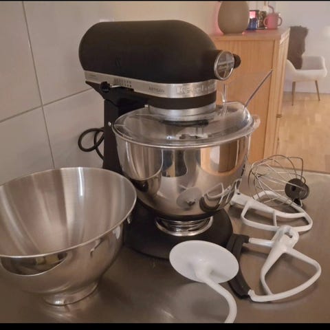 KitchenAid artisan köksmaskin i pistasch färg, maskinen var helt ny när tjejen glömde den på och gick ut, då gick motorn sönder så fick vi en ny motor, nu funkar den som den ska och är super fräsch, det finns fortfarande milde bränd lukt när den är på , det känner man när man är väldigt när , lukten kommer och går bort under en period av användning. Finns att hämta i Järfälla
