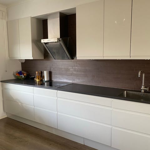 Komplett vitt Vedumkök med vitvaror + spishäll + ugn + fläkt + vask +handfat + blandare + kökshäll i natursten (svar diabas) säljes eller till högstbjudande