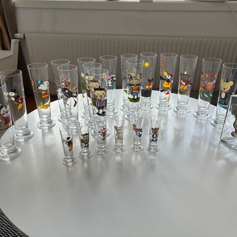 Set med Lasse Åberg glas av olika storlekar med färgglada djurmotiv. Glasen är tillverkade i klart glas och har olika höjder. Passar för servering av drycker.