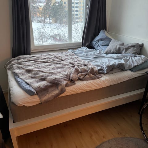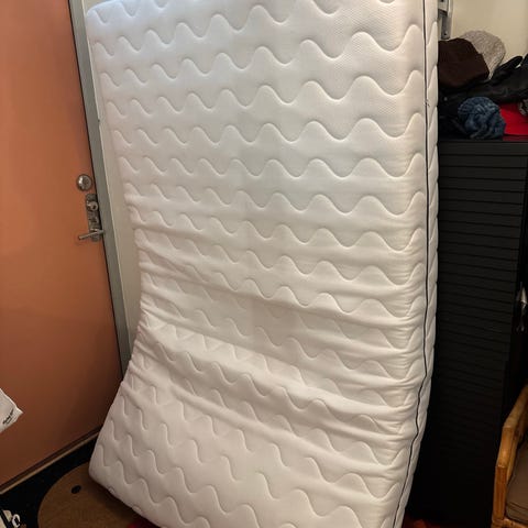 Sängram i järn 120 cm bred. Ribbotten. Tre madrasser, en 20 cm tjock i wellpur och två 10 cm tjocka i vanligt skumgummi. Bortskänkes mot avhämtning av allt ihop. Sängen är nu nedmonterad.