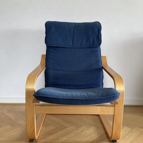 IKEA Poäng fåtölj med blått tygklädsel och ljus trästomme. Fåtöljen har en stoppad sits och rygg för komfort. Passar för vardagsrum eller läshörna.