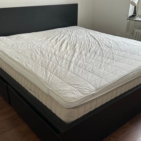 IKEA sängram med måtten 180x200 cm i svart färg. Sängramen har ett enkelt och funktionellt utförande med ribbotten som ger stöd för madrassen.